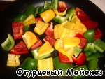 Сладкий перец очищаем от семян и нарезаем на кусочки, примерно равные кусочкам мяса. Обжариваем на растительном масле до румяной корочки и перекладываем в отдельную посуду.