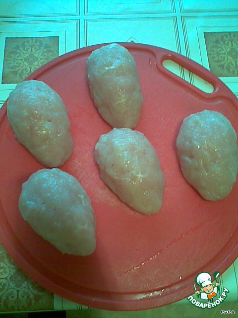 Итак, берем мокрую ладонь шарик из фарша, разделываем его в форме лепешки, в центр кладем "яичко" масла и, обкручивая его фаршем, формируем котлеты в виде большого яйца.