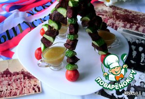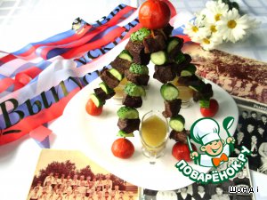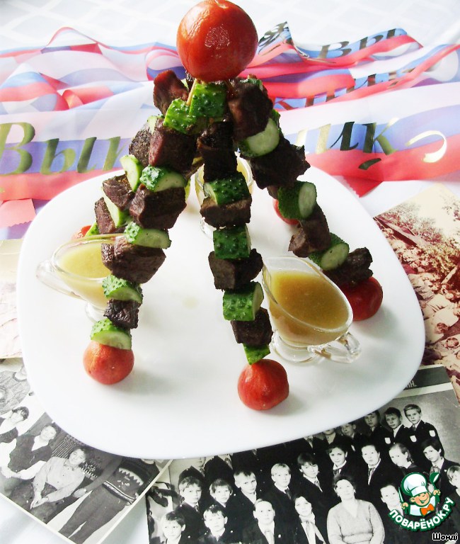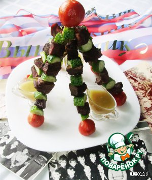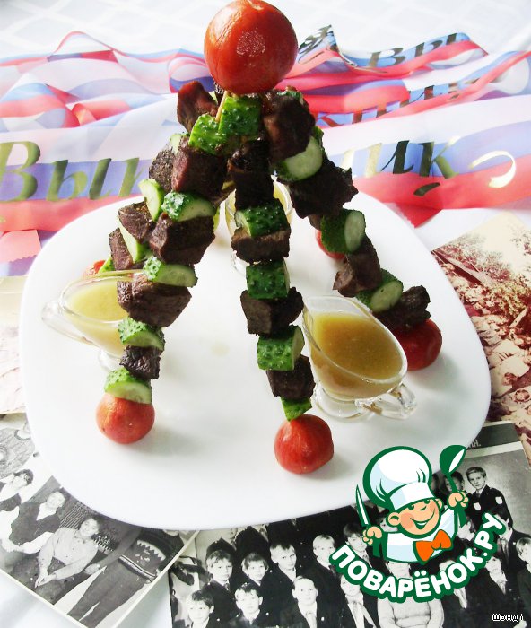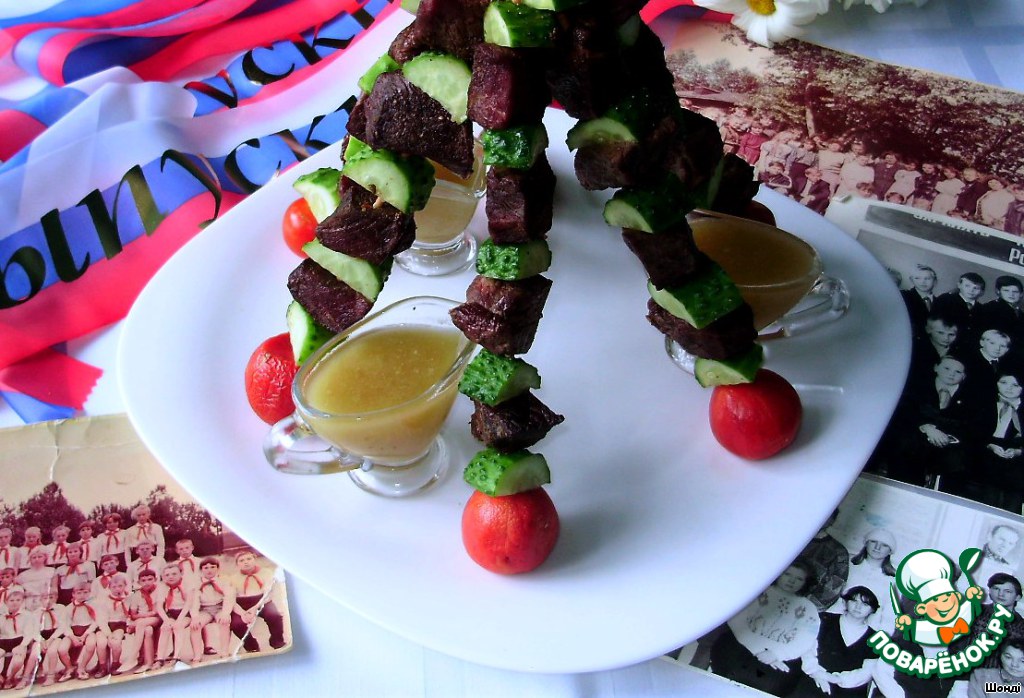 Готовое мясо нанизываем на шпажки, чередуя с ломтиками огурцов и помидоров. Шпажки устанавливаем в виде шалаша, соус наливаем в соусники