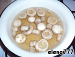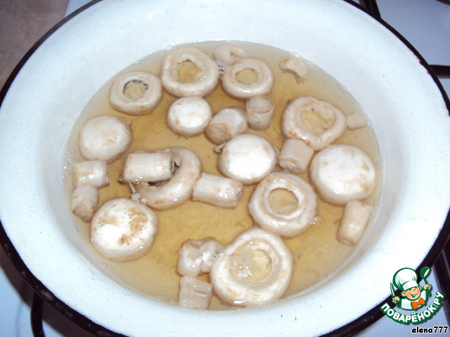 Шампиньоны помыть, разделить на шляпки и ножки, залить кипятком и проварить 2-3 минуты. Отвар сцедить (не выливать, он нам понадобится для заправки). Остудить.