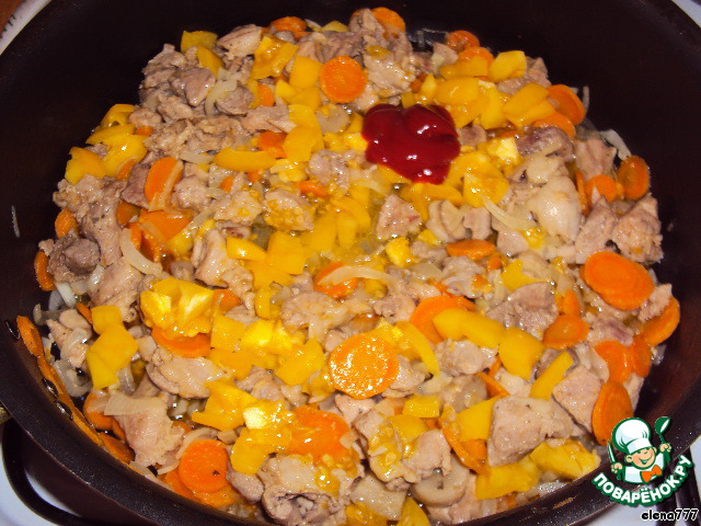 Теперь в мясо с овощами добавить кетчуп, порезанные кубиками помидоры (у меня были жёлтые), порезанные ножки шампиньонов, немного посолить, поперчить, перемешать и потушить 5-7 минут.
