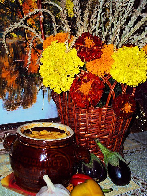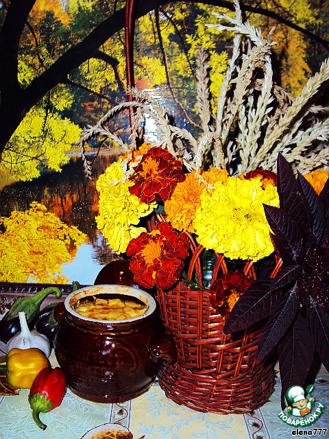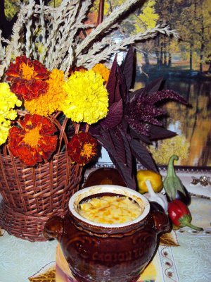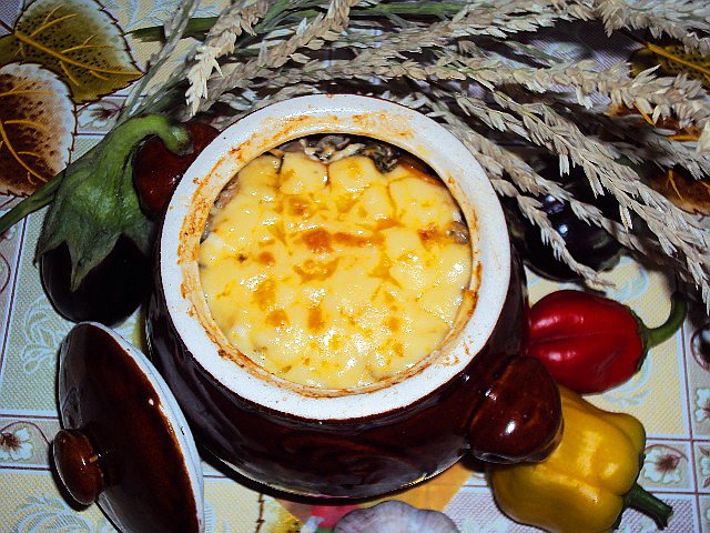 …Вот и наступила, радующая разноцветьем листьев, золотая осень… Прохладный ветерок колышит и ласково срывает с деревьев трепещущие листочки…На пустеющих клумбах ещe грациозно красуются яркие астры и источающие буйный аромат махровые бархатцы, нежно прижимающиеся друг к другу, словно исполняют своe последнее ОСЕННЕЕ ТАНГО… Неутомимые капельки дождя монотонно стучат в серые окна, а дома тепло и уютно…По комнатам разливается запах жаркого, томящегося в глиняных горшочках… Заходите на огонeк и попробуйте необычное ароматное горячее жаркое с золотистой сырной корочкой, под которой вас ожидает приятный сюрприз...
