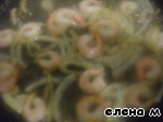 Как только лук начнет приобретать золотистый оттенок, добавляем очищенные креветки, обжариваем, постоянно перемешивая, 1-1,5 минуты.