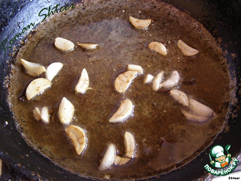 На сковороде разогреваем растительное масло. Чистим и режем пополам чеснок, добавляем его в сковороду, туда же отправляем мускатный орех, черный молотый перец, карри. Добавляем 5 палочек гвоздики.