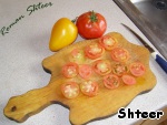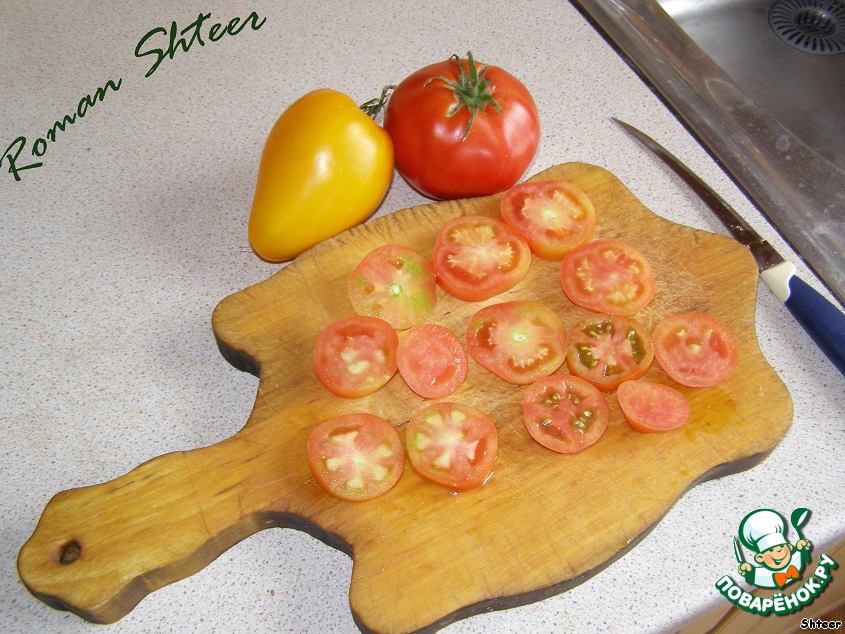 Помидоры обдаем горячей водой, чистим шкурку и нарезаем.