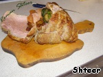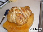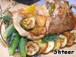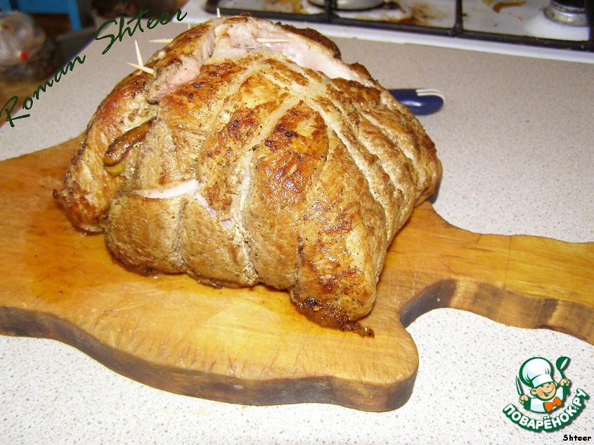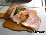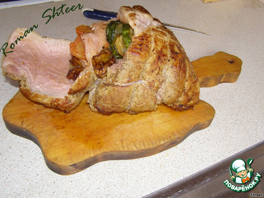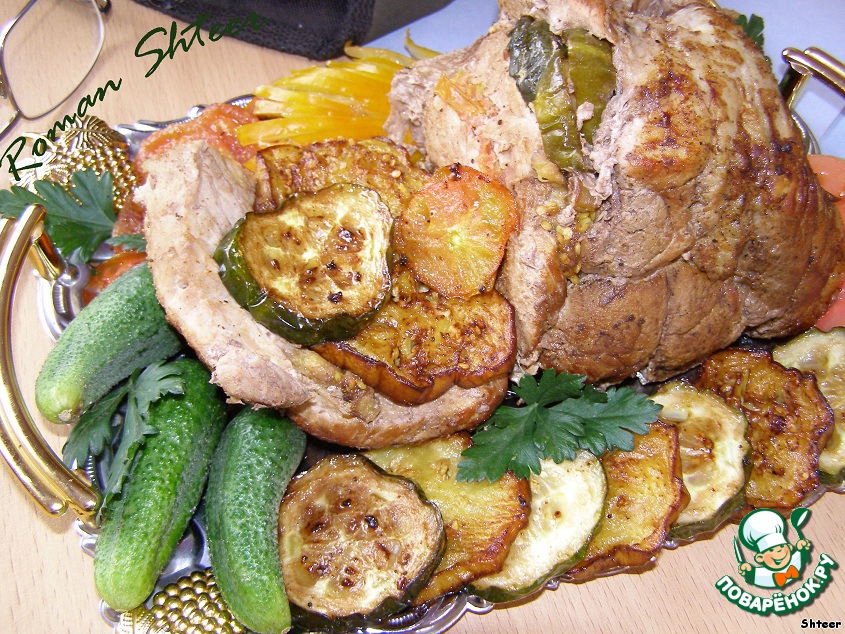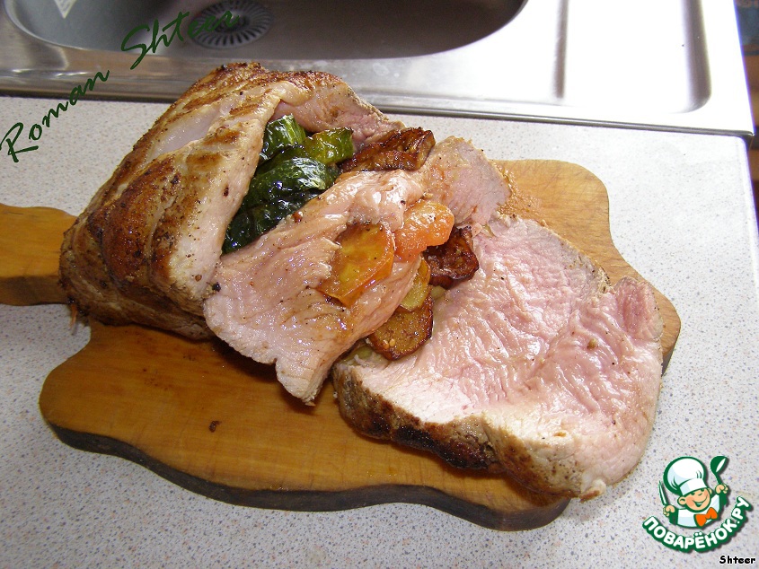 В мясе делаем достаточно глубокие прорези, и отправляем туда примерно половину - три четверти наших обжаренных овощей (остальные пригодятся для сервировки блюда).