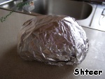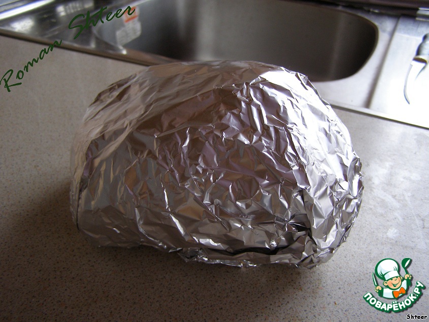Сверху натереть наше мясо солью. Оборачиваем "сумку" в 3-4 слоя фольги, чтобы не осталось не единого отверстия. Отправляем нашу сумку в духовой шкаф на 80-90 минут при температуре 180 градусов.