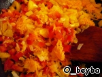Лук обжарим, добавим морковь (я тру на мелкой терке) и порезанный перец.