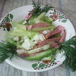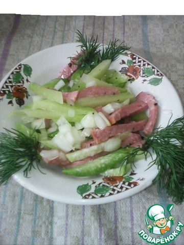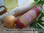 Редька, салями, луковица, растительное масло, соль, перец, веточка сельдерея, это всё, что нужно для салата