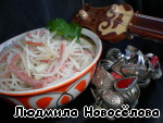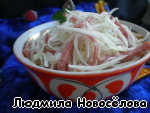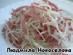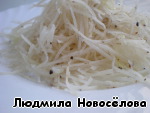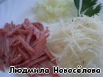 Натереть соломкой редьку, салями нарезать соломкой, нарезать луковицу