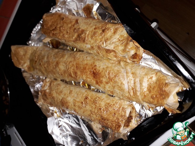 И еще немного соуса перед заворачиванием... заворачивать надо очень аккуратно!!! сверху намазываем немного соусом и отправляем в разогретую до 160-170 град. духовку минут на 10