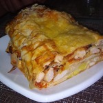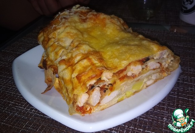 Выкладываем равномерно половину овощной начинки, половину курочки, застилаем вторым лавашом