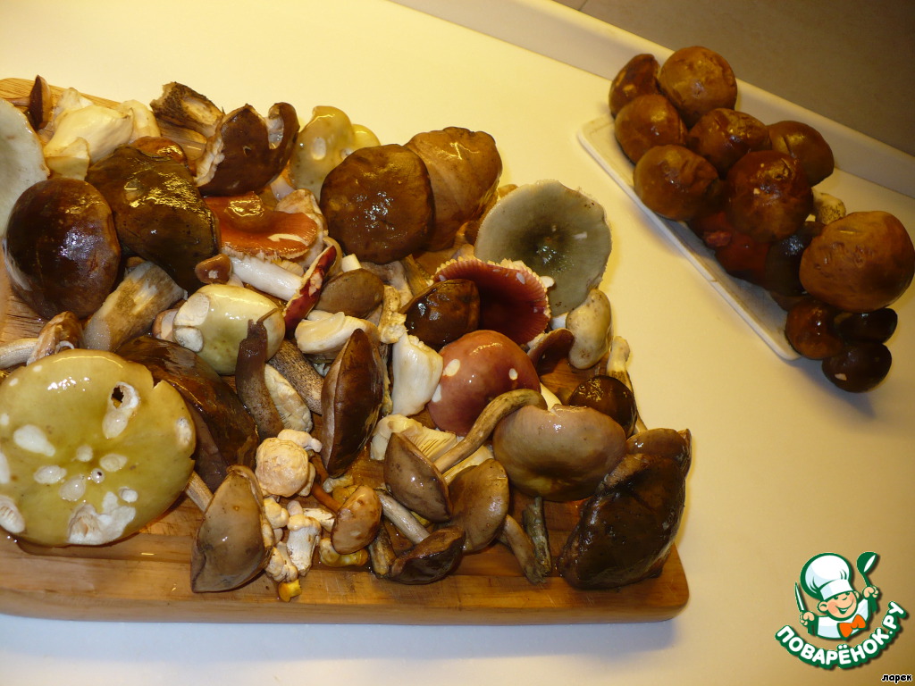 - Грибы (любые. У меня свежие подосиновики, подберезовики, сыроежки, лисички) — 600 г