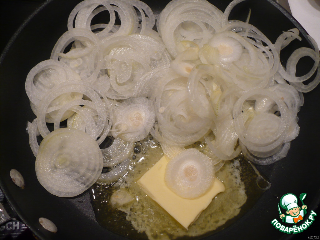 Итак. Луковицу нарезать и поджарить до золотистого цвета на сливочном масле. -