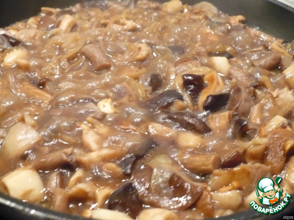 Пока жарится лук, предварительно вымытые грибы режем на кусочки произвольной формы и добавляем к луку. Слегка солим, перчим (не переусердствуйте, в заливке также будут соль, перец и солоноватый сыр), накрываем крышкой и оставляем томиться на 15 минут.