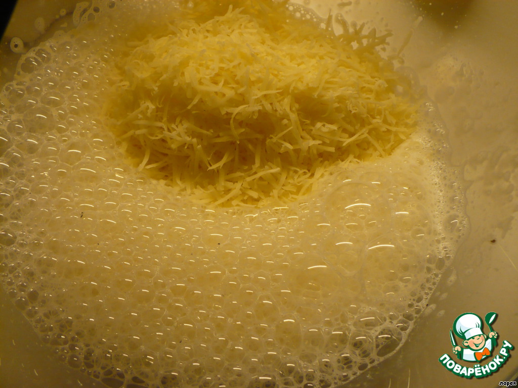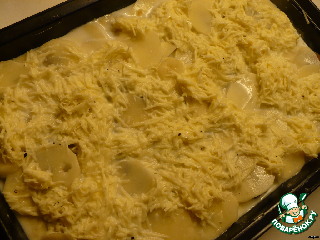 Пока тушились грибы, режем на тонкие пластины картофель и готовим заливку. Яйца взбить с солью и перцем и, не переставая взбивать, влить молоко. Добавить сыр и перемешать
