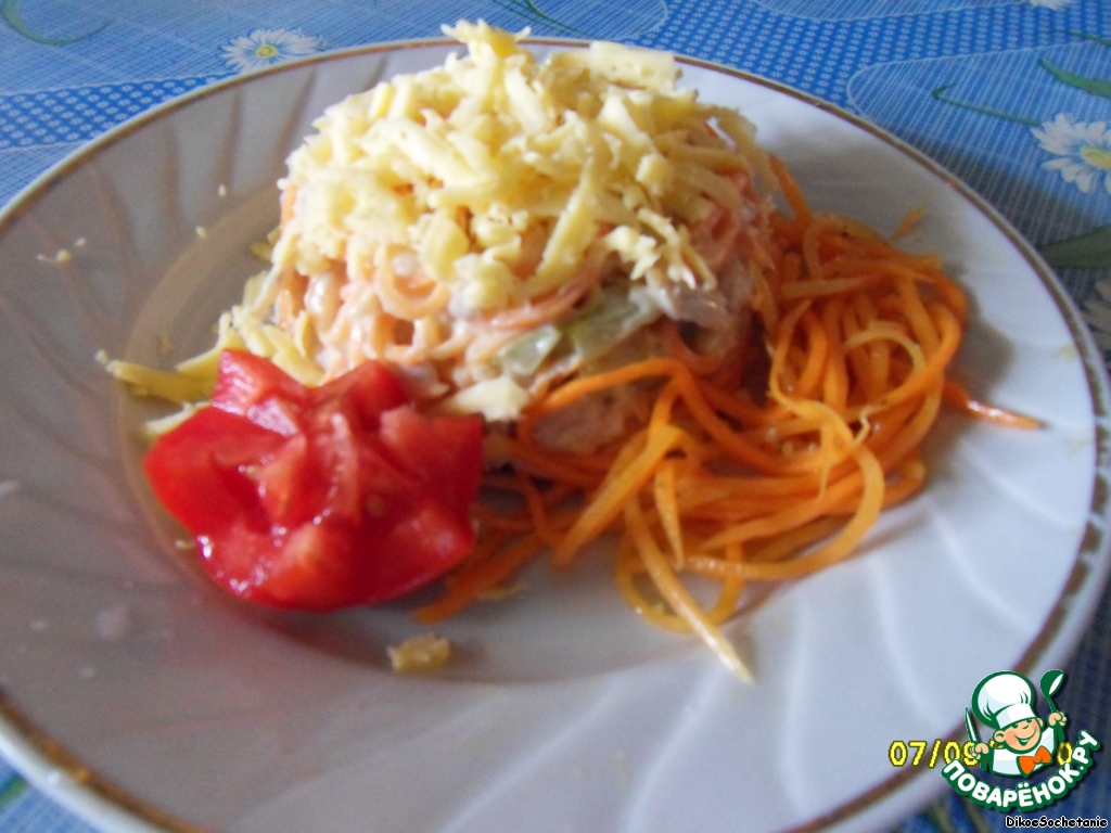 Этот рецепт я впервые увидела в кулинарном шоу несколько лет назад и с тех пор часто его готовлю. Мне нравится сочетание чеснока и майонеза, а морковь по-корейски придает остринку, которую я тоже люблю. Поиск по ингредиентам результатов не дал, так что представляю на ваш суд один из моих любимых салатов )))