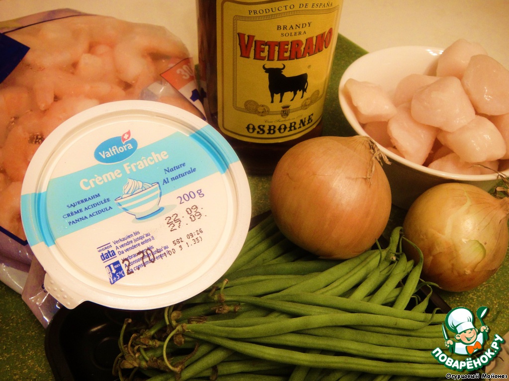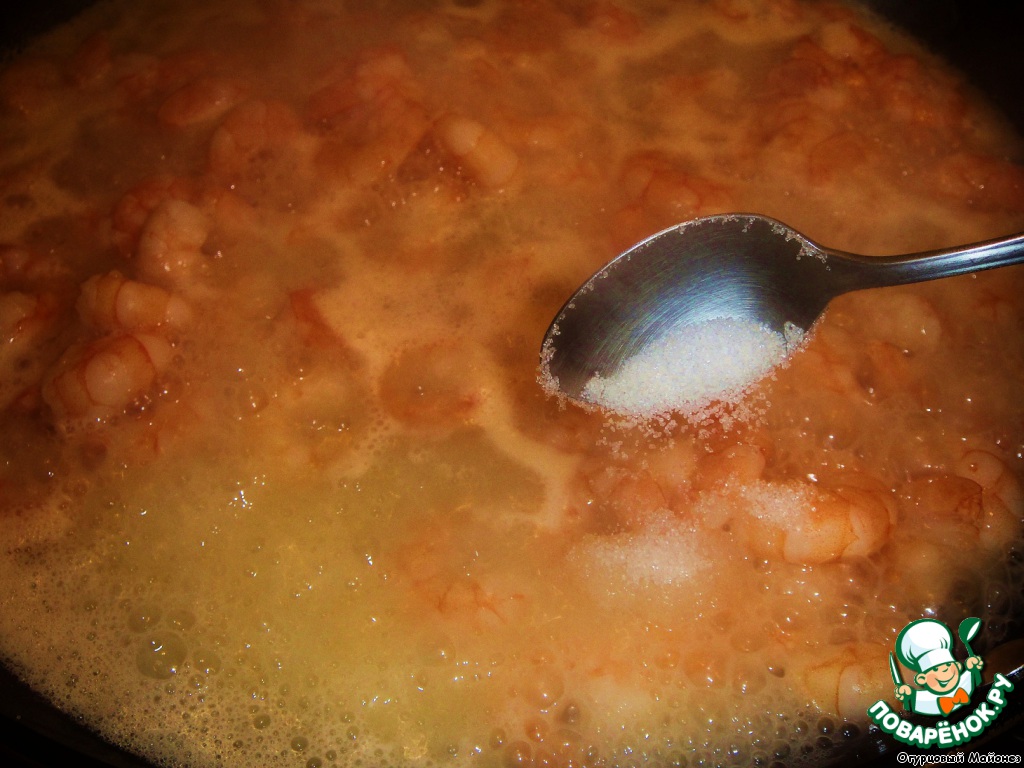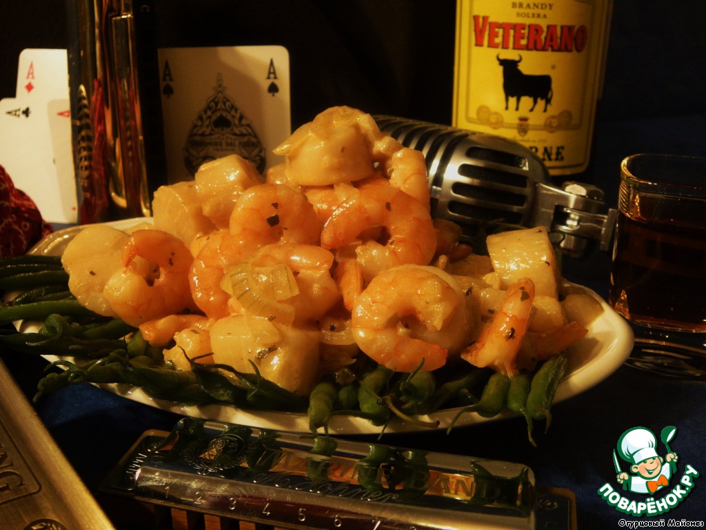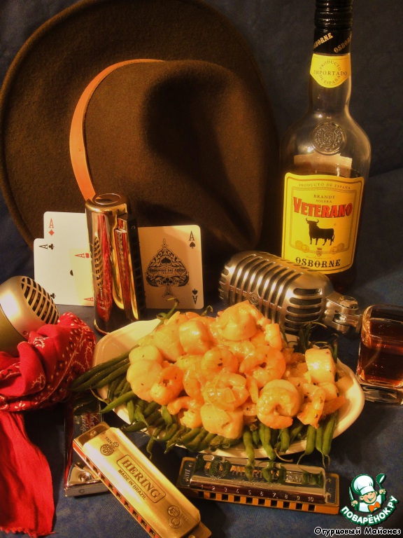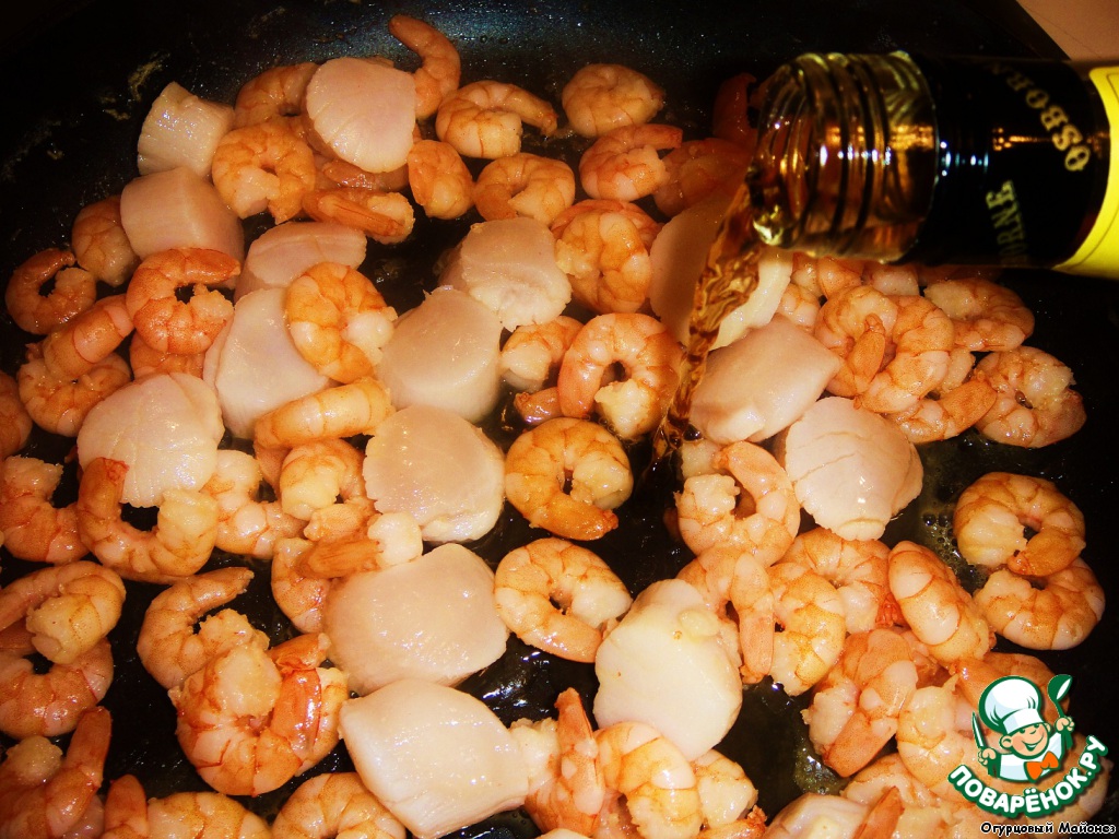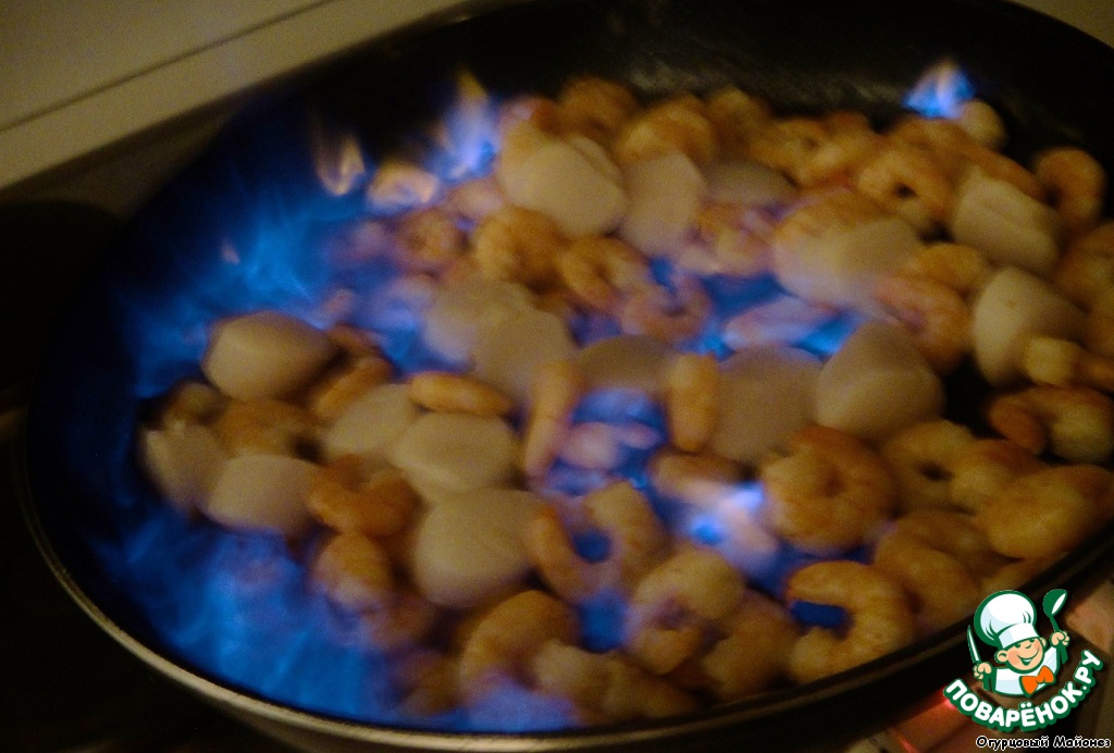 Когда жидкость выпарилась, добавляем к креветкам гребешок (скорее всего к этому времени от уже самостоятельно разморозился), слегка обжариваем и вливаем бренди.