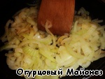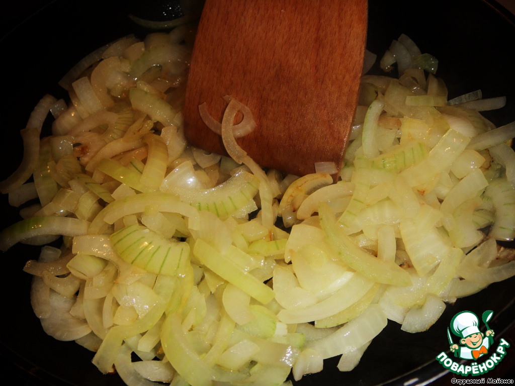Нарезанный четвертинками колец лук обжариваем на растительном масле до прозрачности.