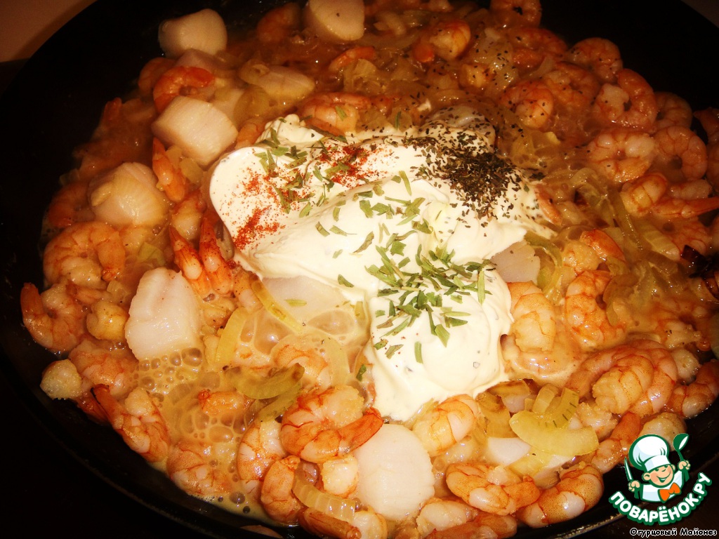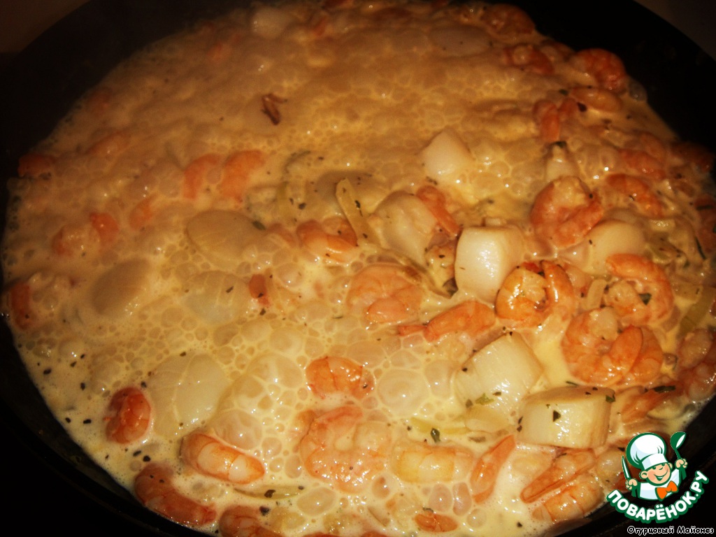По вкусу получается очень интересно. Морепродукты выходят сладковатыми с коньячной ноткой + сливочный соус с луком, который и так всем известен своей мягкостью. [x]09:39 10.09.10 Отредактировано создателем комментария[/x]