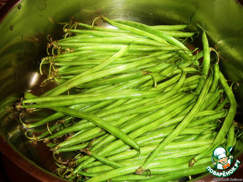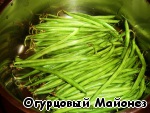 В это время займёмся фасолью: наливаем на дно кастрюли немного воды, кладём фасоль, накрываем кастрюлю крышкой и включаем огонь на максимум. Даём закипеть, создав тем самым эффект «парилки». Убавляем огонь, солим по вкусу и готовим минут пять.