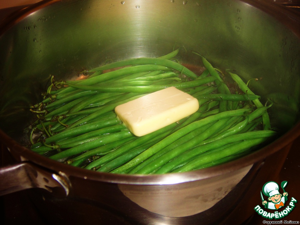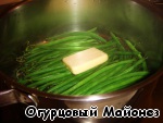 После этого добавляем к фасоли кусочек сливочного масла и продолжаем готовить под крышкой ещё около 5 минут. За это время фасоль пропарится, но останется немного хрустящей, что и является идеальной степенью её готовности для данного блюда.