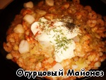 Сервируем следующим образом: дно тарелки выкладываем фасолью, сверху размещаем морепродукты и поливаем сливочным соусом.