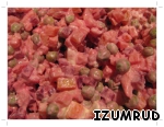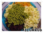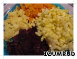 овощи отварить, очистить от кожицы и нарезать кубиками