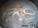 Морепродукты отправить в кипящую воду на 2 минуты, если были замороженные, или на 1 минуту, если растаявшие.