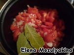 Мелко нарезать. В сотейник влить немного оливкового масла, добавить томаты и лавровый лист, поставить на слабый огонь. Мелко нарезать лук. Добавить к томатам. Довести до кипения, добавить выдавленные через пресс 2 зубчика чеснока и итальянские приправы. Немного уварить. Добавить томатную пасту и мелко нарезанную петрушку. Варить соус еще 3-5 минут. В конце вынуть лавровый лист. В процессе приготовления соуса не забываем его постоянно помешивать.