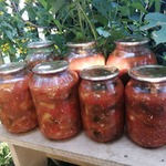 Очень вкусная закатка из баклажанов, сладкого перца и томата. Вариант названия - Десяточка. Не требует больших затрат времени как в приготовлении, так и в употреблении. Рецепт позаимствовала лет 10 назад у институтской подруги и до сих пор не разочаровалась в нем. Количество порций - около 9 литров.