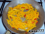 Перец болгарский нарезать тонкой соломкой, острый перец нарезать маленькими кусочками и обжарить на сковороде с оливковым маслом (жарить около минуты, не более, чтобы перец стал чуть мягковатым).
