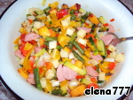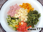 Перец остудить и шумовкой выложить в глубокое блюдо, сцеживая масло (масло не выливать, оно нам понадобится для заправки). В это же блюдо выложить нарезанные полукольцами отварные сосиски, нарезанные соломкой огурцы, помидор и моцареллу - кубиками, отварную стручковую фасоль.