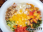Теперь нарезать персики и апельсины крупными кусочками, репчатый лук и грецкие орехи порубить. Добавить в блюдо к остальной массе.