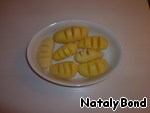 Перед тем как соус вылить на картошку, смазываем ее медом. Потом выливаем соус, в мини-кармашки кладем сыр. Немного майонеза сверху и горчицы.