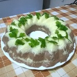 Выкладывала вот в такую форму. Если таковой нет в наличии, можно выложить в разъемную форму для торта, смазав маслом борта, а в центр поставить стакан, но это по желанию. Получается вот такое кольцо.