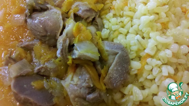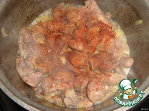Когда пупочки пустят сок. Добавить пол чайной ложечки пищевой соды. На фото не видно, но соус вспенится и лук растворится. Это самая главная тонкость в приготовлении тушеного мяса. (Кстати, мясо так тоже он готовит)