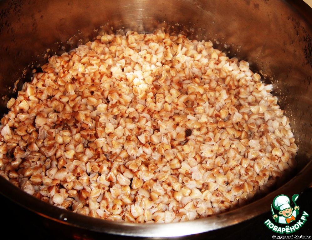 Итак, приступим. Отвариваем гречневую крупу в подсоленной воде до готовности. Снимаем с плиты и оставляем в кастрюле под крышкой. Она понадобится нам на финальных шагах