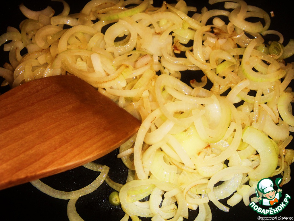 Одну луковицу нарезаем полукольцами и также обжариваем до прозрачности на сливочном масле (отдельно от грибов).