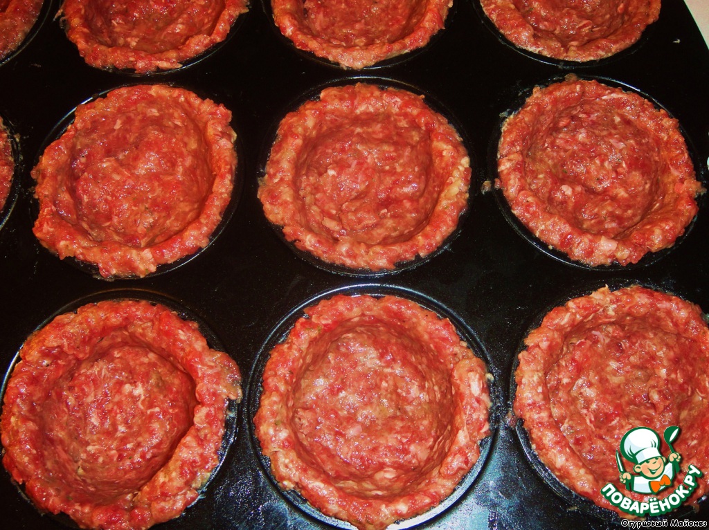 Смазываем сливочным маслом формочки (для кексов) и аккуратно формируем в них корзиночки из фарша.