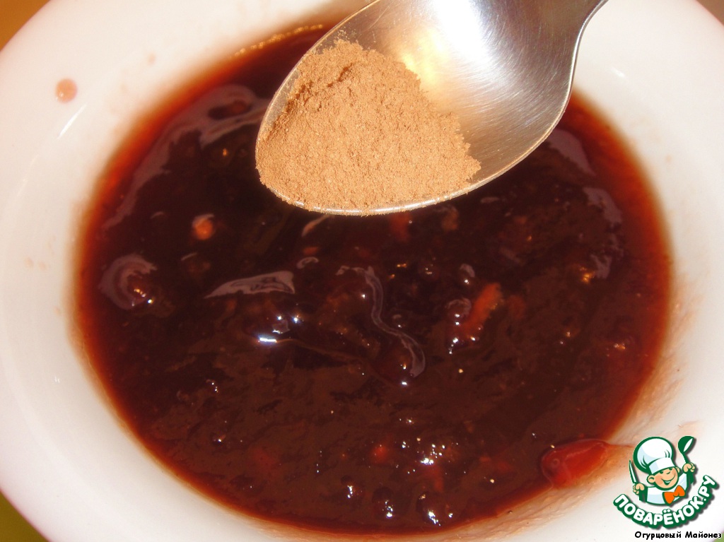 Тем временем готовим соус: брусничное варенье смешиваем с молотой корицей и гвоздикой. У нас получится сладкий соус, который станет прекрасным дополнением к мясным блюдам и, в частности, к этому.