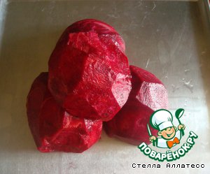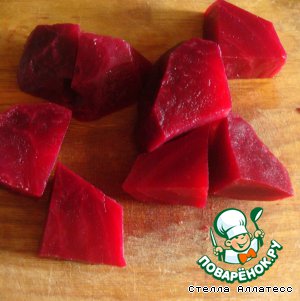 Свеклу очистить и вымыть. Залить водой, поставить на огонь и варить до готовности свеклы. Затем добавить одну столовую ложку 9 % уксуса (для цвета), довести до кипения и выключить. Остудить. Свеклу вынуть.