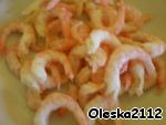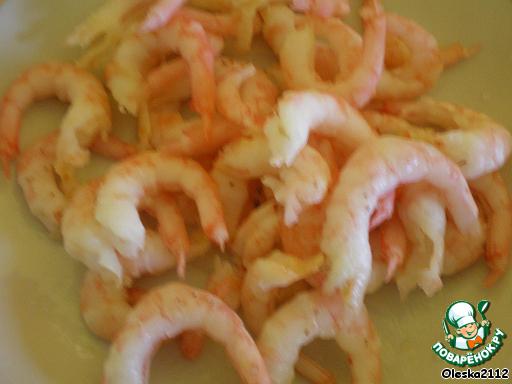 Креветки залить кипятком, дать постоять под крышкой до охлаждения. Почистить.