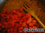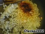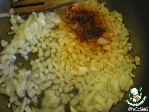 Лук мелко режем и обжариваем на оливковом масле. Чеснок измельчаем и отправляем на сковороду к луку. Туда же добавляем паприку. Чуть-чуть, секунд 30, обжариваем.