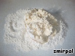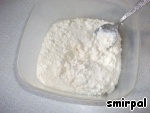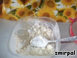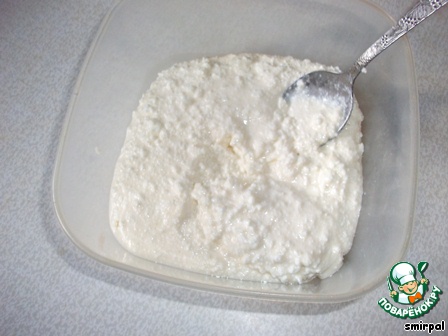 Все ингредиенты, кроме муки, смешать. Получится кашица творожная.
