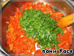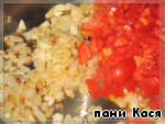 Обжарить лук до легкого золотого цвета, добавить чеснок, быстро обжарить, постоянно мешая. Добавить помидоры, потушить вместе минуту-две.