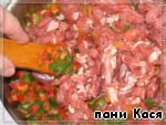Пока пекутся баклажаны, можно не терять времени и нарезать мясо мелко-мелко, как только не лень. Конечно, жилочки и лишний жир убрать. Посолить и поперчить, перемешать.