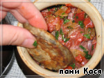 В горшочки на дно положить по 2-3 кружка баклажанов...