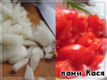 Пока стынут баклажаны, нарезать лук и помидоры кубиками.