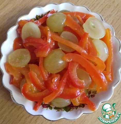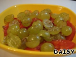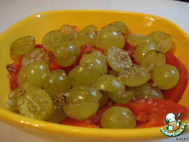 Ягоды винограда снять с кисти, вымыть, разрезать пополам и вынуть косточки (если есть).